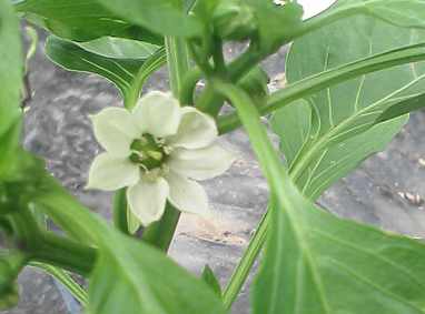 赤パプリカの花。実は真っ赤でも花は白いのです。