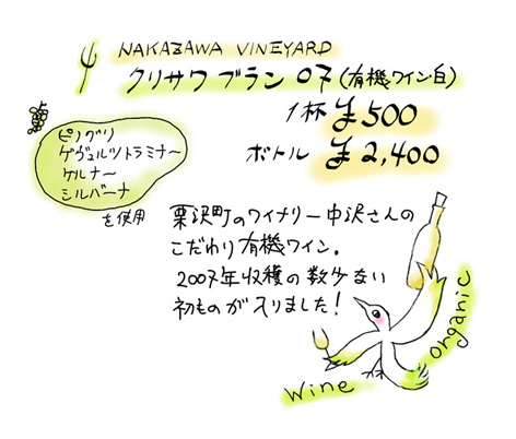 Ψクリサワブラン07(有機ワイン・白)/¥500(1杯)/¥2400(ボトル)