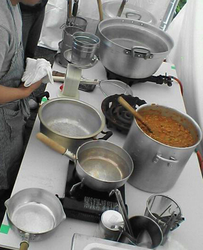 即席青空厨房。スパゲティのラグーソースはこの寸胴鍋に3つ分も仕込みました~。