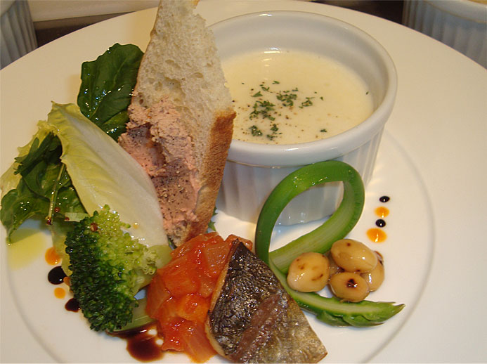 「畑じゃが芋のスープ・鯵の自家製瞬間スモーク・畑の炒り大豆・白レバームース