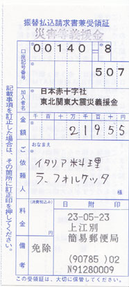 続・贈りました 公開日: 2011年5月28日更新日: 2011年5月28日著者: testeytastカテゴリー: その他のお知らせ 2回目のお届けです。 4月末まで開催しておりましたラ・フォルケッタゆかりの アーティストたちの有志によるチャリティバザーと 店頭の募金箱に寄せられましたあったかいお気持ちです。 次回は6月22日のキャンドルナイトディナーにて チャリティバザーを開催いたします。 ラ・フォルケッタのスタッフによるハンドメイドの・・・(?!) いろいろご用意してます♪ ぜひぜひご参加ご協力ください。 また引き続き店頭の募金箱へのご協力をお願い申し上げます。 関連記事 12 これ鹿Night! 今季もフォルケッタに鹿さんがお越しですよ~[#IMAGE|S23#]鹿とワインの夕べ・・・おたのしみください[#IMAGE|S53#]『ラ・フォルケッタの鹿フェア~これ鹿Night!~』<日時>2015年11月1日(日) […] 公開日: 2015年10月12日更新日: 2015年10月12日著者: testeytastカテゴリー: その他のお知らせ 06 本日9/6は、地震による停電の為、臨時休業いたします。 皆さまの無事をお祈りいたします。 公開日: 2018年9月6日更新日: 2019年5月18日著者: La Forchettaカテゴリー: その他のお知らせ 11 ひそかな人気のドルチェ ラ・フォルケッタ裏メニュー(笑) お誕生日やお祝いのお食事会などにいかがですか? 「ラ・フォルケッタ特製デザート盛合わせ」 (要予約) メッセージフラッグを添えて・・・ ご予約時にお問合せくださいませ メッセージのご希望 […] 公開日: 2011年5月11日更新日: 2011年5月11日著者: testeytastカテゴリー: その他のお知らせ この投稿へのコメント コメントはありません。 コメントを残す コメントをキャンセルメールアドレスが公開されることはありません。 ※ が付いている欄は必須項目ですコメント ※ 名前 ※ メール ※ サイト 次回のコメントで使用するためブラウザーに自分の名前、メールアドレス、サイトを保存する。 Δ この投稿へのトラックバック トラックバックはありません。 トラックバック URL