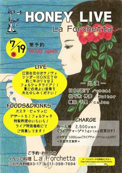 ★フォルケッタのライブイベント★ 公開日: 2015年7月1日更新日: 2015年7月1日著者: testeytastカテゴリー: その他のお知らせ ♪いよいよ久しぶりのハニーライブが近づいて来ました。心地よい音楽聞きながら、夕暮れのゆったりしたひととき、ワインやお料理も楽しめます。ライブチャージ+1drink+前菜付16:00オープン2ステージ(時間未定)♪間にお食事やお飲み物もお楽しみ頂けます。♪ご予約が必要です。お電話、Facebook、メールでも受付いたします。 関連記事 03 ラ・フォルケッタのこども会 最終回お料理編 こども会では、おとなのお料理だけでなく、子供たちにも、年齢にあったお料理を提供しております。 まずはベビーちゃんの離乳食です。 じゃが芋のニョケッティ えだまめとにんじんの二色ソース […] 公開日: 2009年3月3日更新日: 2009年3月3日著者: testeytastカテゴリー: その他のお知らせ 31 フォルケッタ農園のお花たち マダム撮影の農園の花たち。 かれんな亜麻の花 はらりと散ってしまいますが・・・キレイ 野良にんじん・・・?≪追記≫野良にんじんではなくてコリアンダーだった! これはキュウリ! 赤花豆かなぁ。 チコリでしょ! 公開日: 2013年7月31日更新日: 2017年7月9日著者: testeytastカテゴリー: その他のお知らせ 08 クリスマスムード♪ 今日、のっぽろは雪化粧をして なにもかも真っ白になりました さむいさむい・・・ けれどフォルケッタの扉のクリスマスリースに 住んでいる白樺トナカイさんはなんだか いきいきとして見えました さぁ、クリスマスまでもう少し・・ […] 公開日: 2010年12月8日更新日: 2010年12月8日著者: testeytastカテゴリー: その他のお知らせ この投稿へのコメント コメントはありません。 コメントを残す コメントをキャンセルメールアドレスが公開されることはありません。 ※ が付いている欄は必須項目ですコメント ※ 名前 ※ メール ※ サイト 次回のコメントで使用するためブラウザーに自分の名前、メールアドレス、サイトを保存する。 Δ この投稿へのトラックバック トラックバックはありません。 トラックバック URL