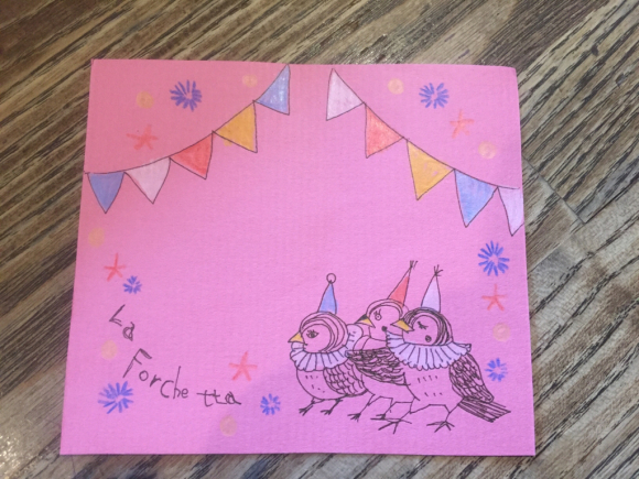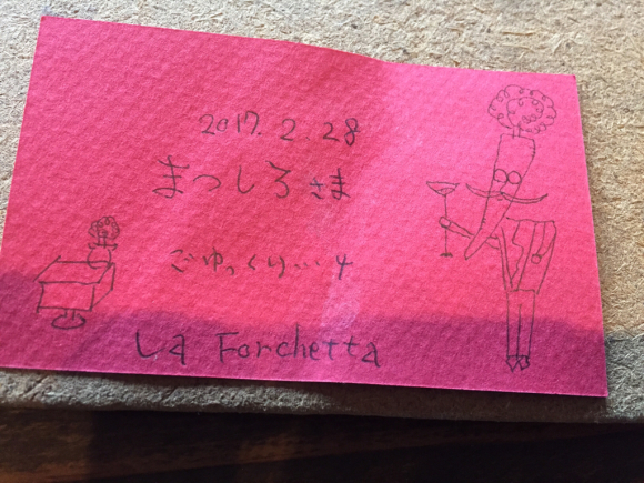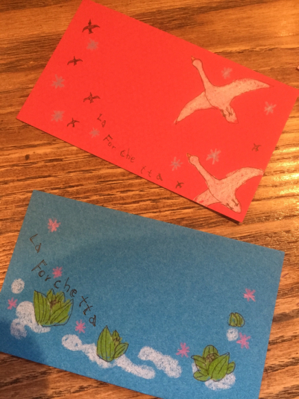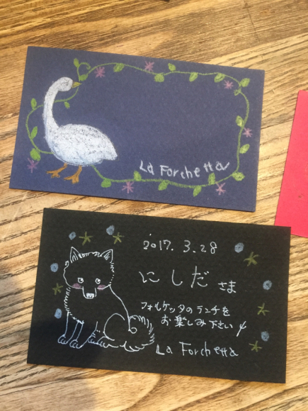 ⭐️フォルケッタの予約カード⭐️ 公開日: 2017年4月21日更新日: 2017年7月18日著者: testeytastカテゴリー: マダムのさんぽみち ご予約のお客様にはいつも、ウェルカムカードを置いているのですが、スタッフの手書きでご用意してます。中でも、キッチンスタッフSakiさんの描くカードは、ちょっと素敵(o^^o)コレクションしたくなっちゃうかも♫どうぞ、ぜひお持ち帰りください٩(^‿^)۶誕生日などの記念日用デザートにつける旗も 他にも色々かわいいカードです!オマケ(^^)ホールスタッフ龍くんの人参執事🥕 関連記事 蝶々が素敵すぎて 今年は特にたくさんの蝶々が見られます。それよ至近距離で(^ω^) 図鑑で調べてみました! ミドリヒョウモンクジャクチョウアカタテハオナガアゲハキアゲハムーミンナス(^^)オマケ 公開日: 2017年8月4日更新日: 2017年8月4日著者: La Forchettaカテゴリー: マダムのさんぽみち 猫のむーちゃん冬暮らし 公開日: 2019年12月21日更新日: 2020年2月3日著者: La Forchettaカテゴリー: マダムのさんぽみち 絵を描きました サクラクレパス90色クレヨンを楽天セールで買ってもらいました(o^^o)もうすぐ誕生日ということで😁 はじめに描くものは、ライブのポスター画。まずは下書き。 奇抜にいろんな色を塗りますね!だって90色😚 明るくどんどん塗 […] 公開日: 2017年7月19日更新日: 2017年7月19日著者: La Forchettaカテゴリー: イベント, マダムのさんぽみち この投稿へのコメント コメントはありません。 コメントを残す コメントをキャンセルメールアドレスが公開されることはありません。 ※ が付いている欄は必須項目ですコメント ※ 名前 ※ メール ※ サイト 次回のコメントで使用するためブラウザーに自分の名前、メールアドレス、サイトを保存する。 Δ この投稿へのトラックバック トラックバックはありません。 トラックバック URL
