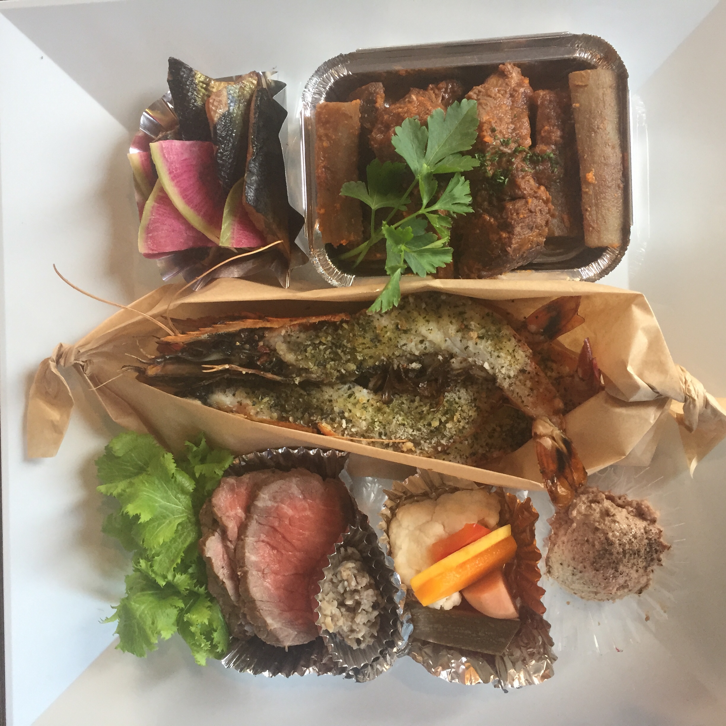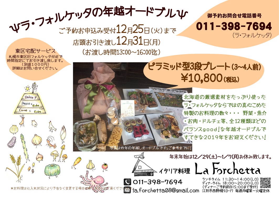 フォルケッタの年越しオードブルは、3段重ねのピラミッド型+パスタやパンやその他諸々、選りすぐりの北海道産食材を使ったまごころ込めたお料理の数々…。およそ12〜14品を少しずつ、3〜4人前でご用意いたします。皆様の団欒のお席に華を添えられたらと思います。