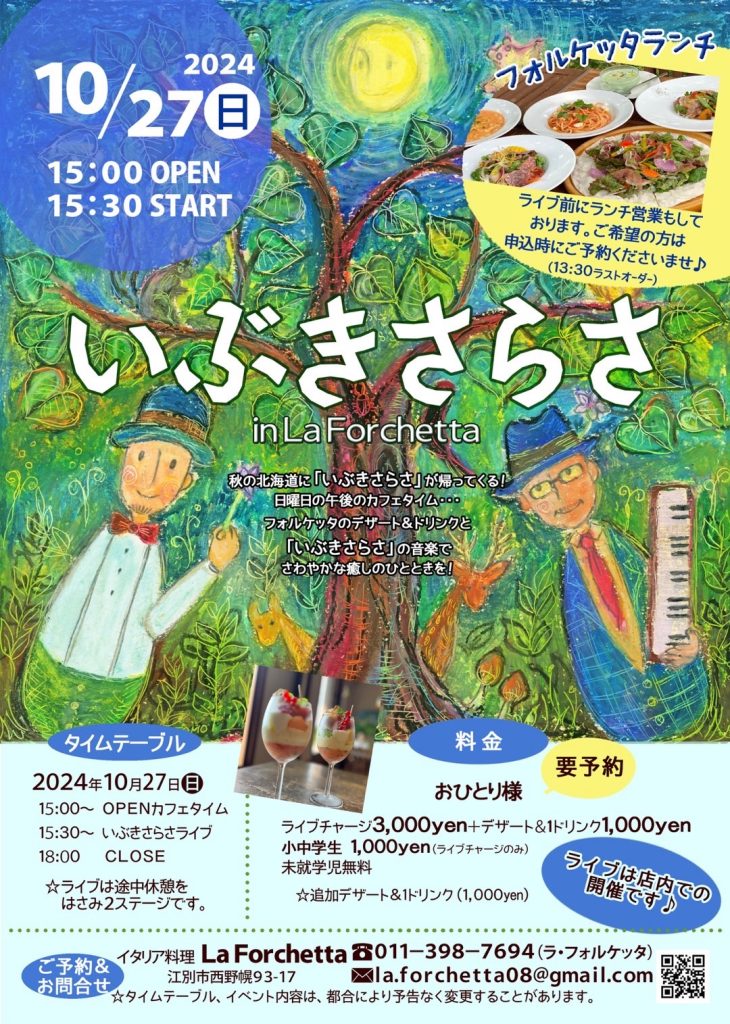 いよいよ週末いぶきさらさライブ あと3日!?いぶきさらさinフォルケッタʕ•̫͡•ʔ♬✧ご予約MAXありがとうございますm(__)m すっかり秋も深まり、日暮れも早くなりました。お庭も解放してのFoodTimeの予定ですが、寒くなる事も予想されますので […] 公開日: 2017年9月26日更新日: 2017年9月26日著者: La Forchettaカテゴリー: イベント